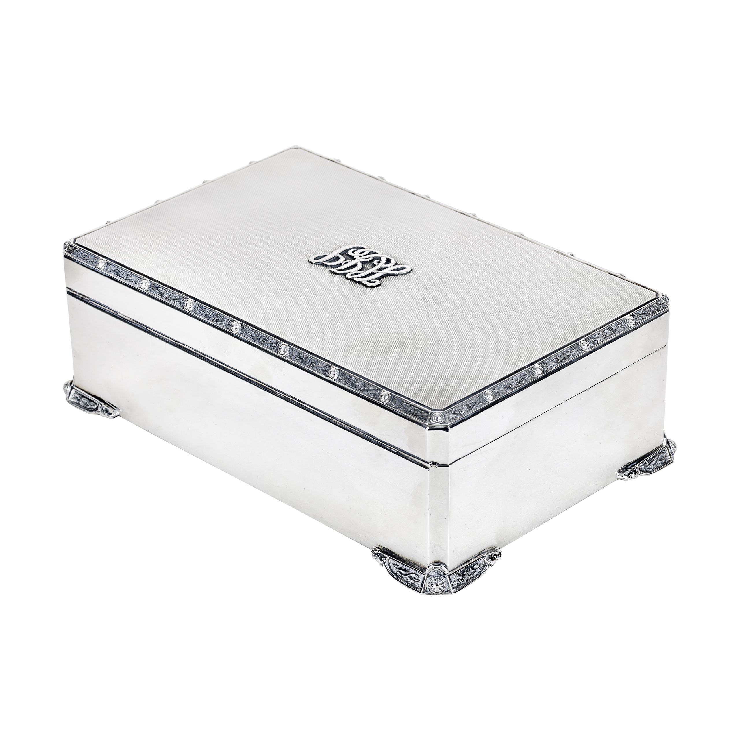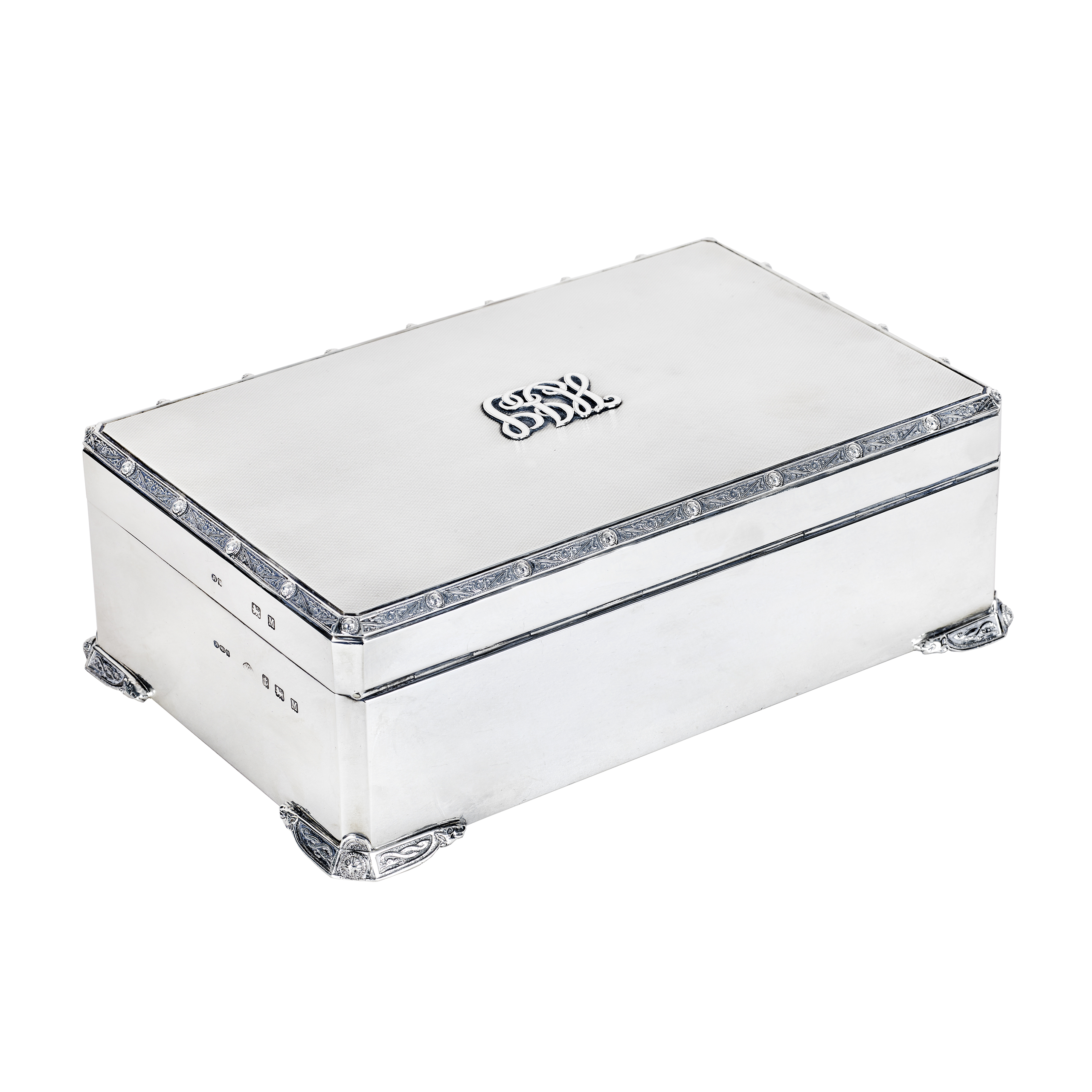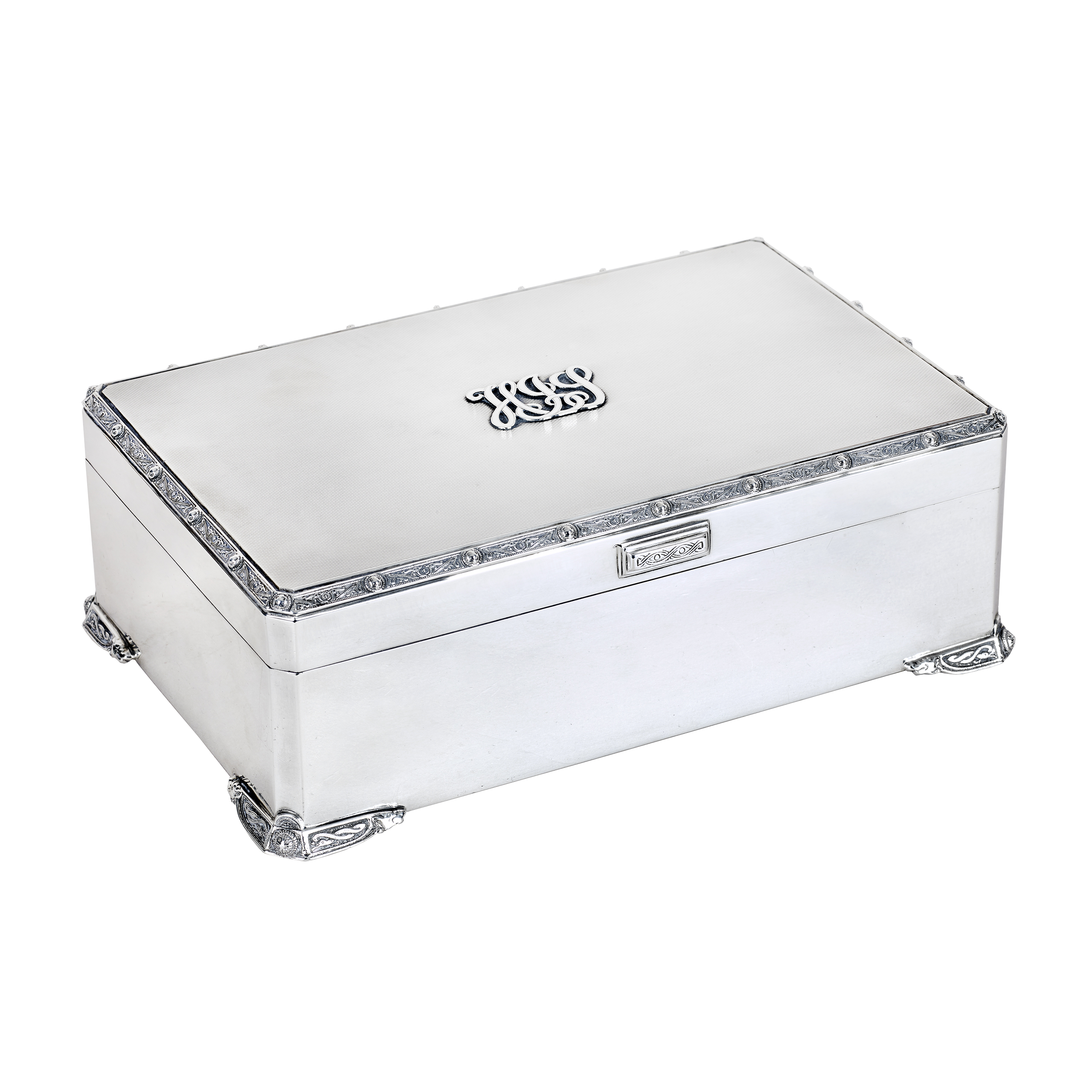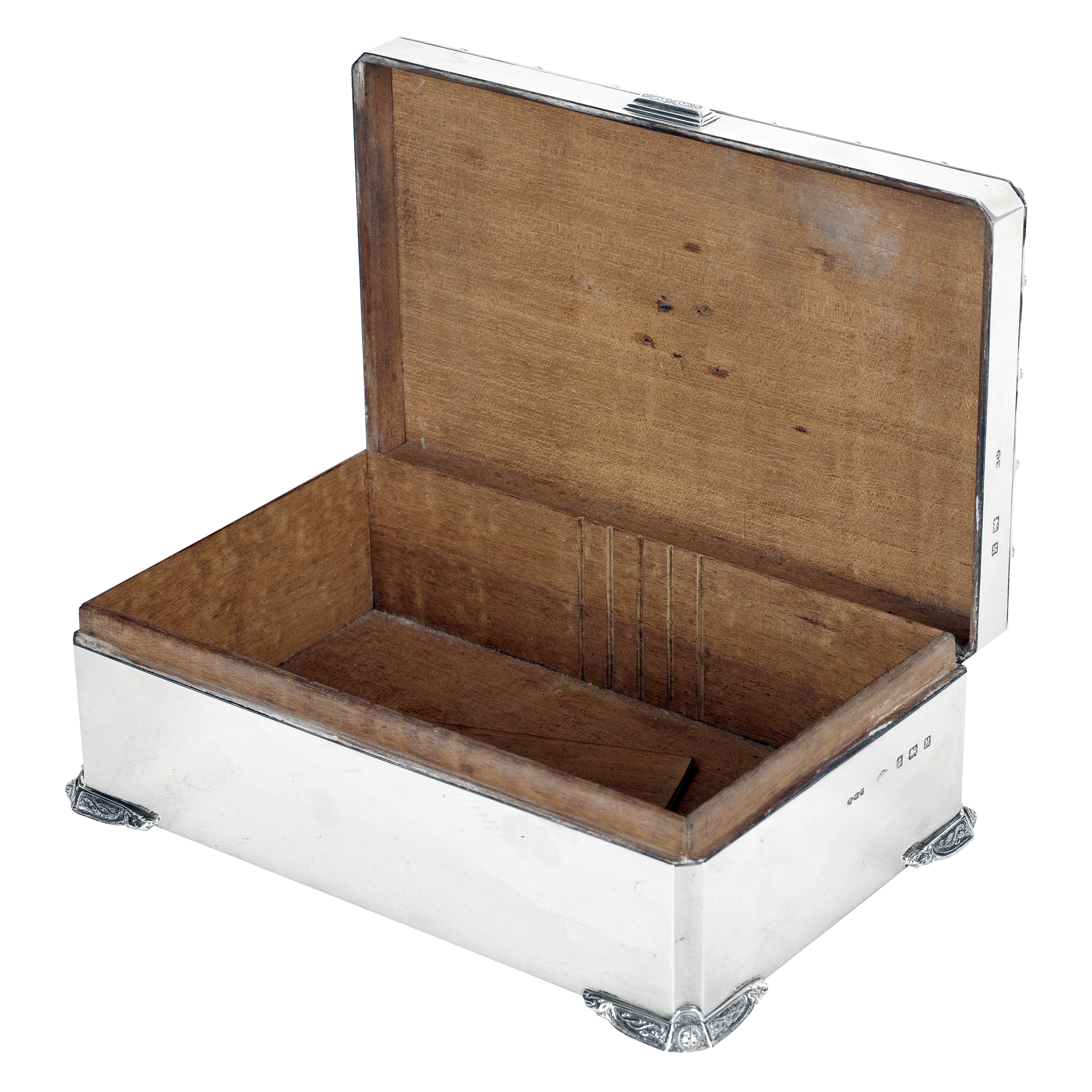 A fine example of a solid silver cigar box / cigarette box with an elegant Celtic design concave beveled edge on the lid, cedar lined interior, raised on elaborate Celtic feet.