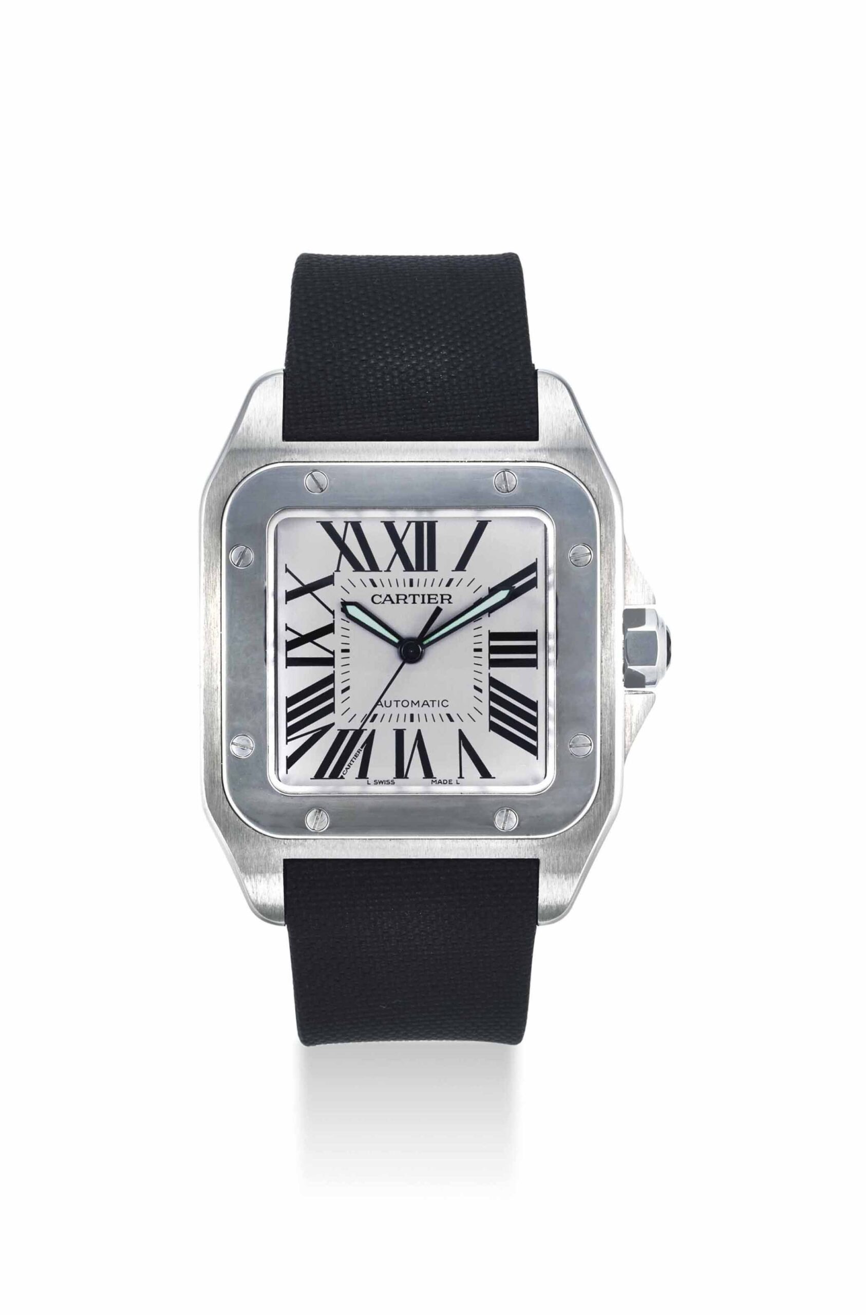 A stainless steel Cartier Santos 100, featuring the signature square case with exposed screw bezel, silvered dial with bold black Roman numerals, and blued steel sword-shaped hands. Powered by an automatic movement, the watch includes a date aperture at four o’clock and is fitted with a black rubber strap and stainless steel deployant clasp. Retaining the elegant yet sporty aesthetic for which the Santos line is renowned, this model embodies Cartier’s timeless blend of precision engineering and refined design. Measuring 41mm excluding the crown, this stainless steel automatic example is offered on a black rubber strap with deployant clasp.